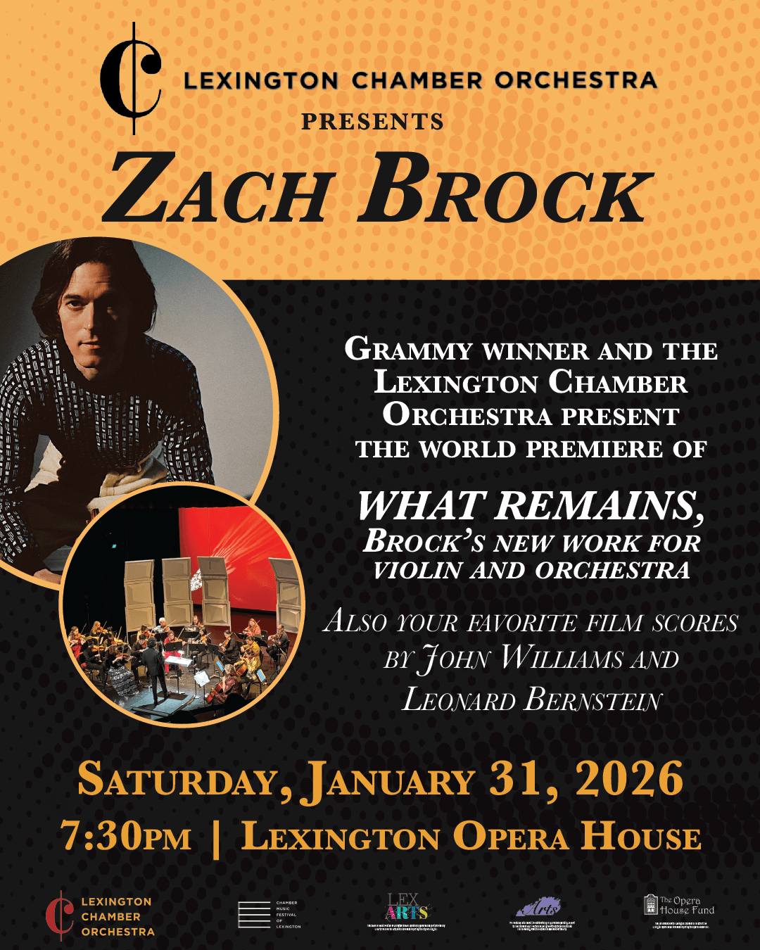 Due to challenging weather, the LCO's January 31st concert with Zach Brock at the Lexington Opera House has been rescheduled for May 9th at Centenary Church on Tates Creek Road. All those who had purchased tickets will get full refunds from Ticketmaster. Thanks for your understanding.